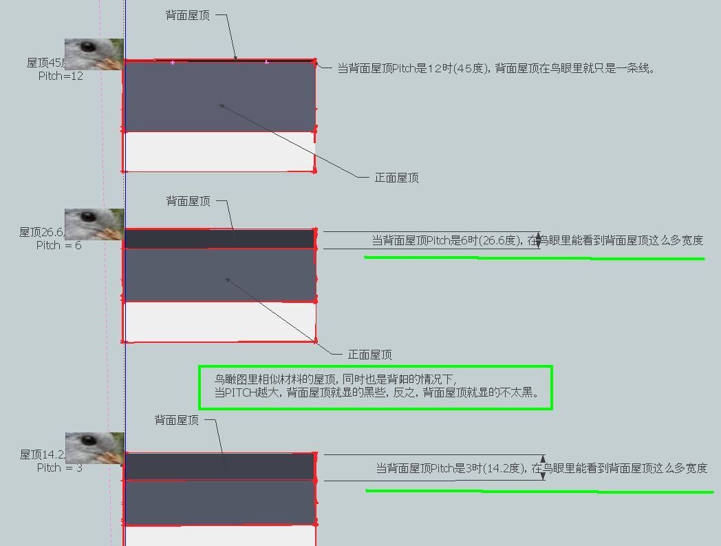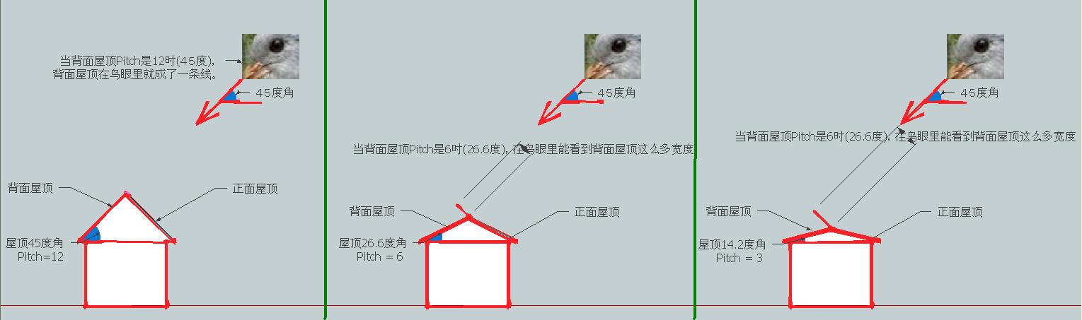 同样宽度(屋脊到屋沿的距离)的背着鸟眼的屋顶,PITCH越小就看到越多,PITCH越大就看到越少。大于等于12时看不见了。