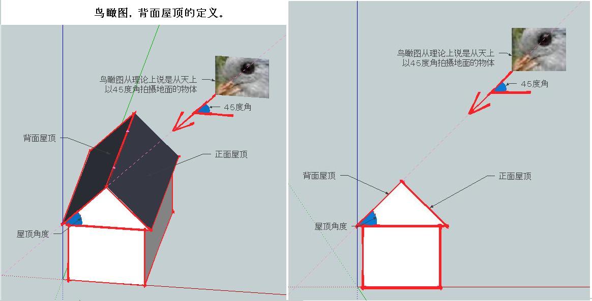5。目测时还要考虑背面屋顶是否正好背向鸟眼?或说是否有夹角。
